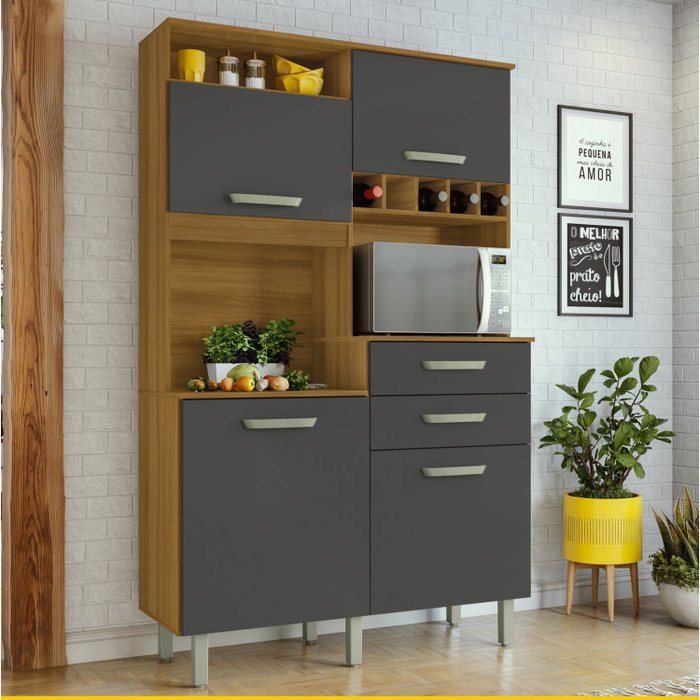 Armário de Cozinha 4 Portas 2 Gavetas Jr com Porta Garrafas Amadeirado Freijó/Grafite