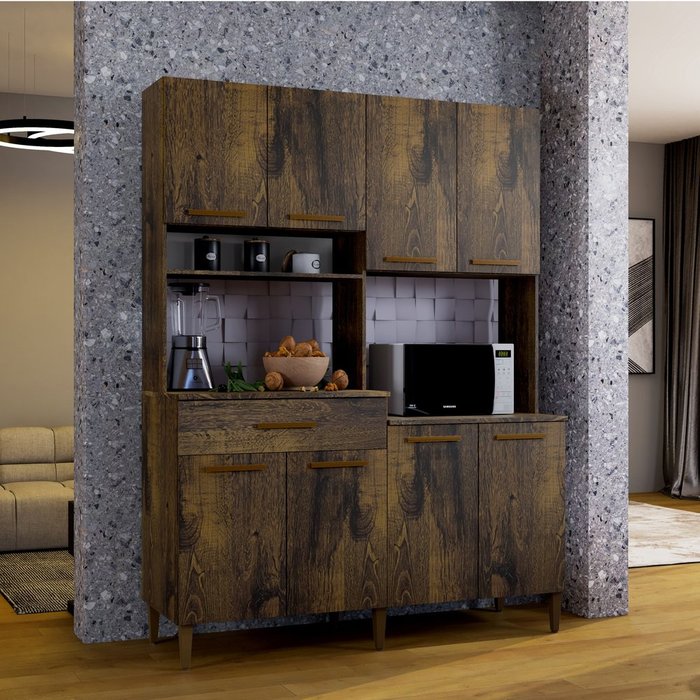 Esse modelo é composto por armários e gavetas que oferecem espaço suficiente para armazenar utensílios de cozinha e eletrodomésticos.