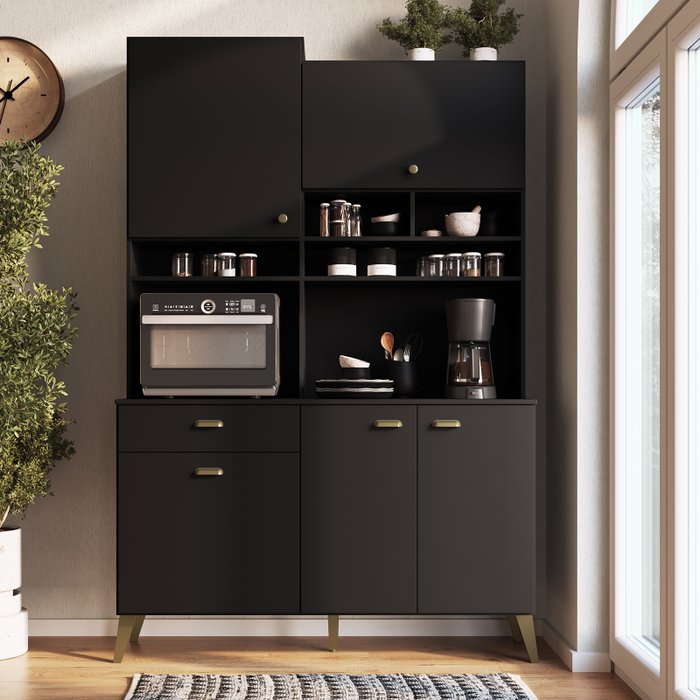 Esse modelo é composto por armários e gavetas que oferecem espaço suficiente para armazenar utensílios de cozinha e eletrodomésticos.