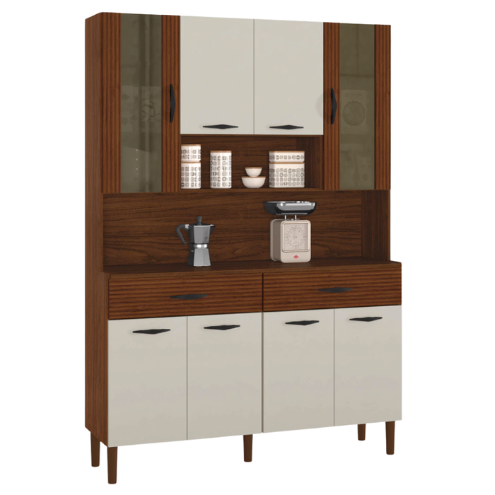 Uma cozinha completa, moderna e cheia de estilo para deixar sua casa de cara nova. O Armário de Cozinha Golden conta com 8 portas sendo 2 portas superiores com vidro temperado deixando seu ambiente ainda mais moderno, 2 gavetas espaçosas, e excelente aproveitamento no espaço interno, com prateleiras e nichos para pequenos objetos ou decoração. Além de contar com pés resistentes que não agridem o piso. Combinação perfeita de beleza, resistência e durabilidade.