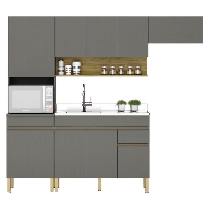 Armário de Cozinha Completa 120 com Balcão para Pia 9 Portas Line Freijó Gris