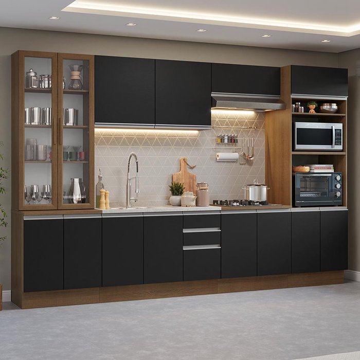 Armário de Cozinha Completa 340cm Rustic/preto Glamy Madesa 01