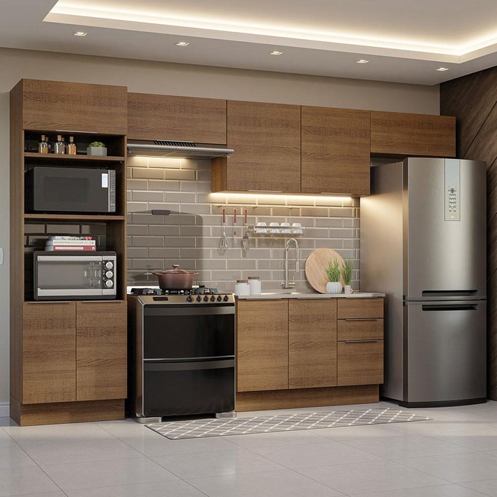 Com ampla capacidade de armazenamento, essa cozinha oferece espaço suficiente para acomodar muitos utensílios e os eletros. Além disso, o balcão tem capacidade para pias de 120 cm x 52 cm e todos os módulos inferiores possuem pés reguláveis em PVC, além de rodapé removível em MDP