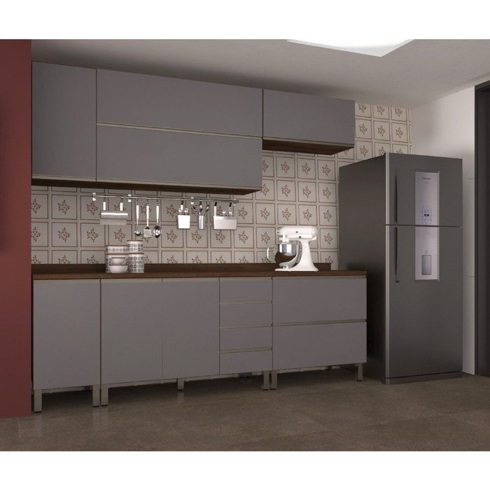 Armário de Cozinha Completa com 6 Peças e Tampo Jade Luciane Móveis Nogueira Dourado com Cinza Puro