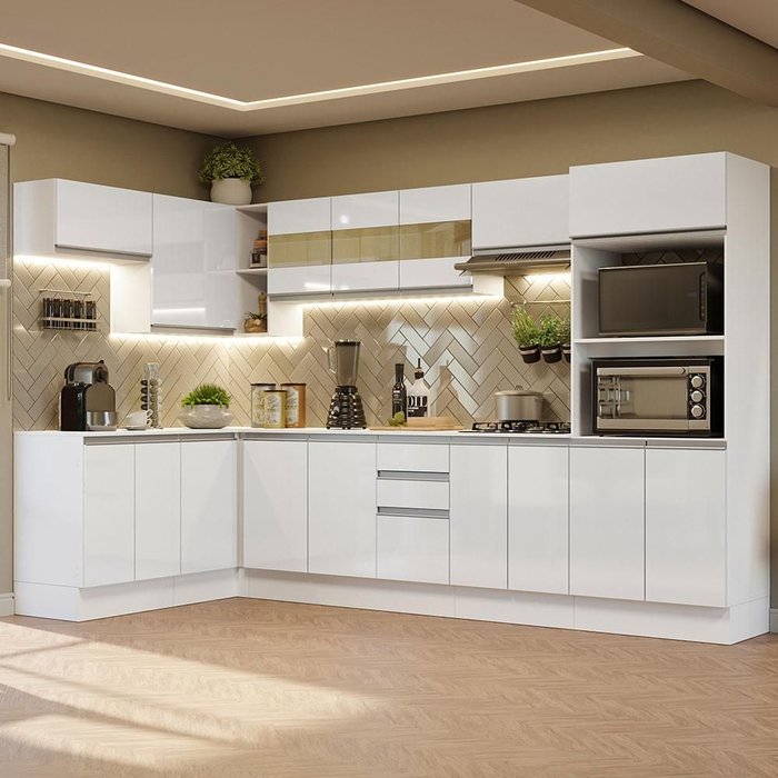 Armário de Cozinha Completa de Canto 100% Mdf 447cm Frentes Branco Brilho Smart Madesa 02