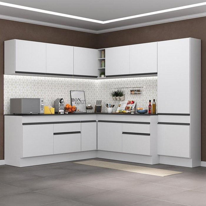 A Cozinha Completa de Canto com Rodapé Veneza Multimóveis MP2102 com Armário e Balcão tem um excelente custo benefício e um amplo espaço interno. Produzida em MDP com acabamento acetinado (cerca de 20% de brilho), que garante maior durabilidade e resistência, possui corrediças metálicas (mais leveza no manuseio), rodapés, que deixam o ambiente mais estiloso, puxadores em ABS e tampo em MDP 15mm com pintura de alta resistência. Os módulos de canto podem ser montados dos dois lados (esquerdo ou direito), conforme a sua preferência. Esta cozinha conta, ainda, com balcão com tampo removível (compatível com pia de 120 cm), com 1 gaveta e 2 portas. Os módulos são individuais e você pode montar da maneira que se adaptar melhor ao seu ambiente. Para deixar sua cozinha mais bonita e organizada, possui paneleiro e compartimento especial para utensílios mais altos.