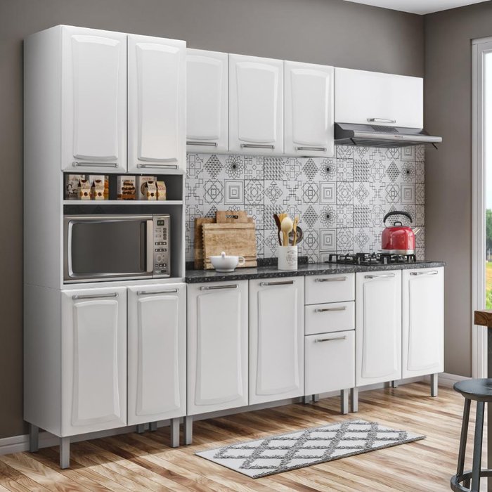 ITENS INCLUSOS: 1 Paneleiro para micro-ondas, 1 Armário Aéreo Triplo, 1 Balcão de 1,20m e 1 Balcão de 0,80m