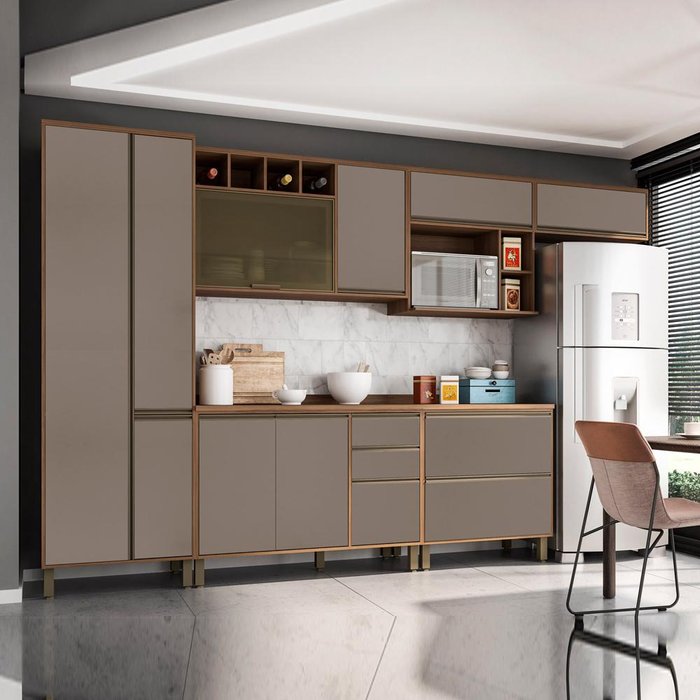 | Itens Inclusos | 1 Paneleiro Duplo, 1 Armário Aéreo 1,20m, 1 Armário Geladeira, 1 Armário com Suporte para Microondas, 1 Balcão Triplo e 1 Balcão Duplo com Duas Gavetas; Manual de montagem, Ferragens e Acessórios |