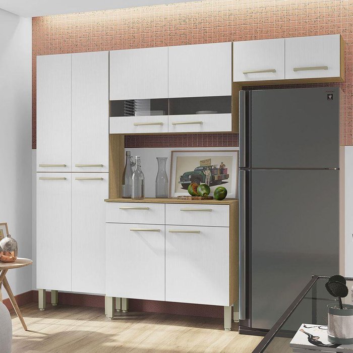 Armário De Cozinha Compacta Nala Freijó Supremo 8 Portas 2 Gavetas E Balcão Com Tampo - Kits Paraná Armário de Cozinha Compacta Nala Freijó Supremo 8 Portas 2 Gavetas e Balcão com Tampo - Kits Paraná Essa belíssima Cozinha Nala irá trazer praticidade e aconchego para o seu ambiente. Dispõe 8 portas sendo duas delas com vidro espelhado, 2 gavetas corrediças e dobradiças metálicas. Além de prateleiras internas com divisões e balcão com tampo liso, Puxadores em ergonômico plástico metalizado, Pés reguláveis em plástico resistente, Acabamento em pintura fosca e textura. Aproveite! Especificações Técnicas:Cor: Freijó SupremoGarantia: 3 Meses garantia fabricante contra defeito de fabricaçãoConteúdo da Embalagem: 1 Armário, Kit Ferragem e Manual de MontagemModelo: 2936-8976Tamanho Montado: 193 cm x 221,6 cm x 36,3 cm - Altura x Largura x ProfundidadeProduto Montado: NãoNecessita Montagem? SimMaterial Principal: MDPAcabamento:Pintura fosca e texturaPeso: 68 KgPossui Portas: 08Possui Gavetas:02Possui Prateleiras: Sim, interiorPossui Vidro Espelhado: Sim em 2 Portas do AéreoTipo de Dobradiças:MetálicasTipo de Corrediças:MetálicasTipo de Puxador: Ergonômico em plástico metalizadoPossui Pés: Sim, reguláveis em plástico resistenteRecomendações de Uso, Manutenção e Limpeza:Nunca utilize álcool ou materiais abrasivos para limpeza. Informações importantes:• Fotos meramente ilustrativa. Os objetos que ambientam as fotos não acompanham o produto.• As cores do produto podem variar de acordo com o monitor, a iluminação do ambiente ou sua percepção visual.• A compra do produto não acompanha montagem/desmontagem.• Montagens, desmontagens e instalações são responsabilidades do cliente. Estes serviços não estão inclusos no valor do produto. Para evitar imprevistos na sua entrega, confira as dimensões do produto no momento da compra e certifique-se de que ele passará por elevadores, portas, escadas e corredores, já que nossa entrega não inclui a subida de lances de escada ou o içamento de produtos.• Verifique a complexidade antes de decidir montar sozinho, orientamos que este produto seja montado por um profissional de sua confiança, após a sua entrega.• Todas as instruções, manuais e peças necessárias para a montagem são fornecidos junto com o produto, não nos responsabilizamos pela instalação/montagem.• Fornecemos somente assistências, por defeitos de fábrica.
