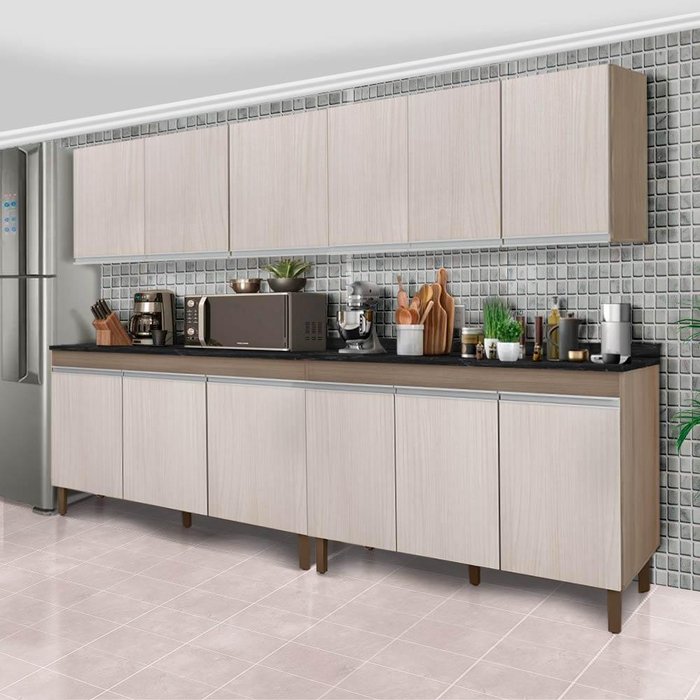 Dimensões dos balcões: Largura 119 cm; Profundidade 52 cm; Altura 86 cm.Dimensões dos armários: Largura 119 cm; Profundidade 32 cm; Altura 61 cm.Itens Inclusos: 2 balcões e 2 armários aéreos- Quatro peças: 2 balcões e 2 armários aéreos- Acompanha tampo- Caixaria e frente com pintura fosca- Tampo com pintura alto brilho- Amplo espaço interno- Dividido em prateleiras internas- Possui 12 portas- Pés com regulagem- Design clássico- Produto 100% MDP de 15mmComplexidade da montagem: Média, pode ser montado por mais de uma pessoa e/ou necessite de maior conhecimento para montagem.Recomendações de uso, manutenção e limpeza: Limpar com flanela ou pano macio seco, não utilizar produtos abrasivos, desengordurantes, álcool ou solvente. Não expor o produto diretamente a luz solar e à umidadeGarantia: 3 mesesOBS: Foto meramente ilustrativa, objetos, utensílios e decoração não fazem parte do produto.