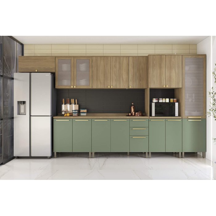 Armário de Cozinha Modulada Completa Reta 13 Peças 4,00m Botanic Kappesberg - Nogueira/verde Oliva
