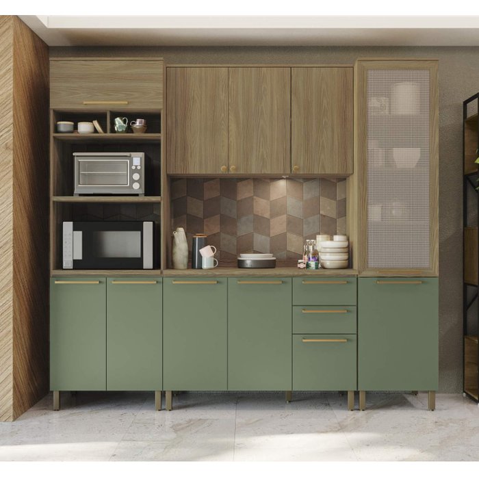 Armário de Cozinha Modulada Completa Reta 8 Peças 2,40m Botanic Kappesberg - Nogueira/verde Oliva