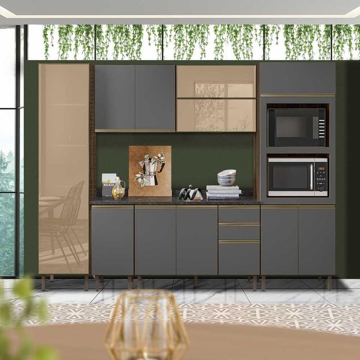 - Produtos com estrutura 100% MDF- 1 armário aéreo com 2 portas- 2 armários aéreos com porta basculante em vidro reflecta- O vidro reflecta conta com superfície espelhada que reflete o ambiente conforme a incidência de luz. Também possui certa transparência que permite enxergar o que tem dentro do armário- 1 balcão 120 cm com tampo (caso opte pela instalação da pia, basta retirar o tampo). Possui 2 portas e 3 gavetas, sendo uma delas um gavetão- 1 balcão 40 cm com 1 porta- 1 paneleiro com porta em vidro reflecta- 1 torre quente com espaços para forno e microondas- Pia não inclusa- Excelente espaço interno- Corrediças telescópicas- Dobradiças com amortecedor- Pés com regulagem de altura- Puxadores em perfil alumínioDimensões do armário aéreo 2 portas: Largura 80 cm; Profundidade 31 cm; Altura 68 cm.
