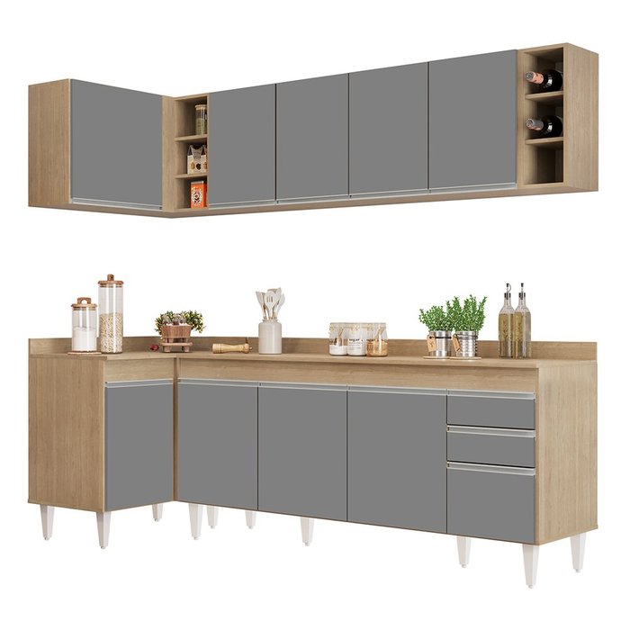 Além disso esse jogo de cozinha completo ainda conta com uma maior resistência contra riscos e umidade, garantindo sua durabilidade por muito tempo, graças ao acabamento em BP. Já os pés ajustáveis permitem você nivelar o móvel em qualquer tipo de piso. Para completar, o design contemporâneo dessa cozinha de canto se adapta facilmente a qualquer estilo de decoração, ao passo que a configuração em L otimiza a circulação no ambiente.