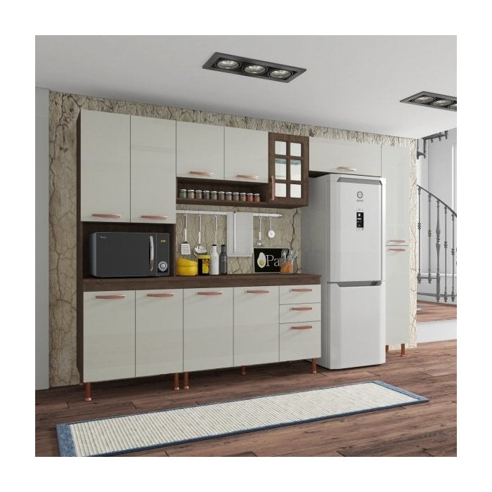 Armário de Cozinha Planejada com Balcão 13 Portas 2 Gavetas Off White/Noce Indekes Marie 204x305x53