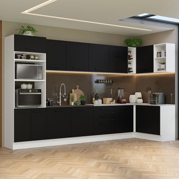 O acabamento da estrutura é branco e o das portas e frentes é preto. É feito em Pintura Poliéster ecológica com sete camadas, que destaca a tonalidade e protege o móvel.