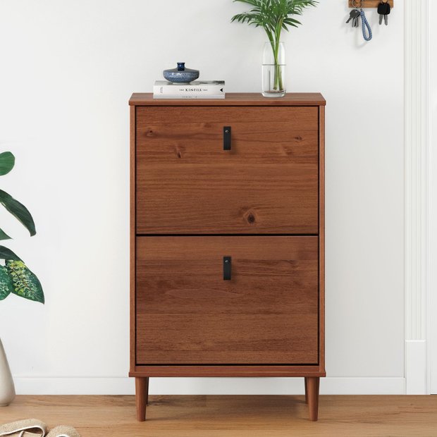 Produzida em madeira maciça de alta qualidade, este Móvel Pequeno de Organização de Sapatos é resistente e durável, trazendo um toque natural ao ambiente. Os puxadores de couro adicionam um detalhe elegante e moderno, enquanto os pés levemente torneados conferem um charme escandinavo ao design.