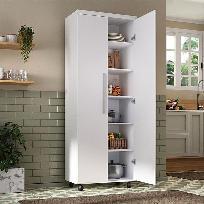 * Imagens meramente ilustrativas. Armário multiuso e multi-ambiente, possui 2 portas e 5 prateleiras internas, sendo 4 delas móveis e apenas a do meio fixa. Muito comumente é utilizado como sapateira, guarda-roupa infantil, para guardar mantimentos, produtos de limpeza ou no escritório. - 6 Espaços dividido por prateleiras para organizar melhor os objetos; - Chapa de MDP 15mm de espessura; - Pintura UV; - Dobradiças Metálicas; - Rodízios com chapa de ferro; - Puxadores cromados. Dimensões do produto montado: altura 182 cm largura 67 cm profundidade 39 cm Manual de montagem disponível no site do fabricante. Atenção: Não nos responsabilizamos, no ato da entrega, por desmontagens, subir escadas/elevadores ou transporte por guincho para apartamentos. Eventuais despesas são de responsabilidade do cliente. Confira as dimensões deste produto e certifique-se de que o mesmo passará normalmente por supostos elevadores, portas, escadas e/ou corredores de sua moradia.