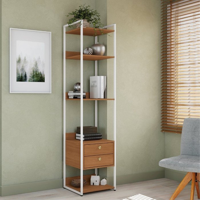 Armário Estante Organizadora Torre 2 Gavetas 3 Prateleiras Canela/Branco Brilho - Otimize cantos com estilo industrial.