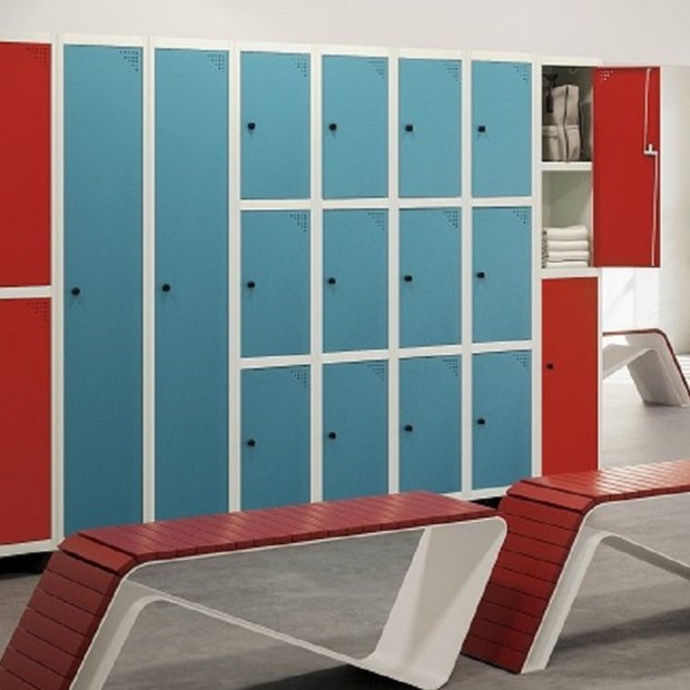 Armário Roupeiro de Aço totalmente montável, dispensa a utilização de parafusos, estrutura em chapas #24 e #26 (0,60mm e 0,45mm) conta com uma porta com estampos circulares em formação triangular para ventilação, sistema de fechamento de varão de 3 pontos, através de pitão para cadeado.