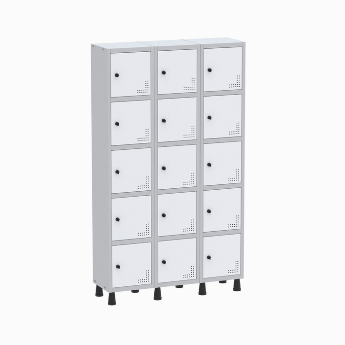 Armário Roupeiro de Aço totalmente montável, dispensa a utilização de parafusos, estrutura em chapas #24 e #26 (0,60mm e 0,45mm) conta com uma porta com estampos circulares em formação triangular para ventilação, sistema de fechamento de varão de 3 pontos, através de pitão para cadeado. Em conformidade com as normas NR17.