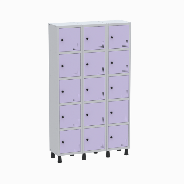 Armário Roupeiro de Aço totalmente montável, dispensa a utilização de parafusos, estrutura em chapas #24 e #26 (0,60mm e 0,45mm) conta com uma porta com estampos circulares em formação triangular para ventilação, sistema de fechamento de varão de 3 pontos, através de pitão para cadeado. Em conformidade com as normas NR17.