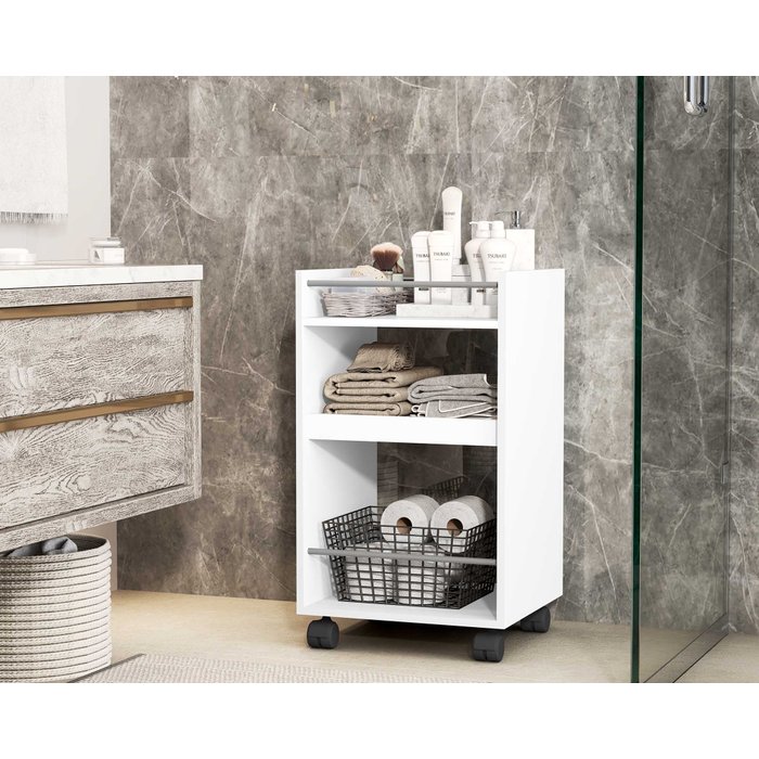 Ele possui 03 Andares e 01 deles possui Prateleira Fixa com Batente para acomodar o que precisar do seu banheiro, ele também possui 4 rodízios para movimenta lo e assim facilitar na limpeza do seu banheiro. Possui 4 Hastes plásticas na cor cinza para dar o acabamento e proteção ao seus itens.