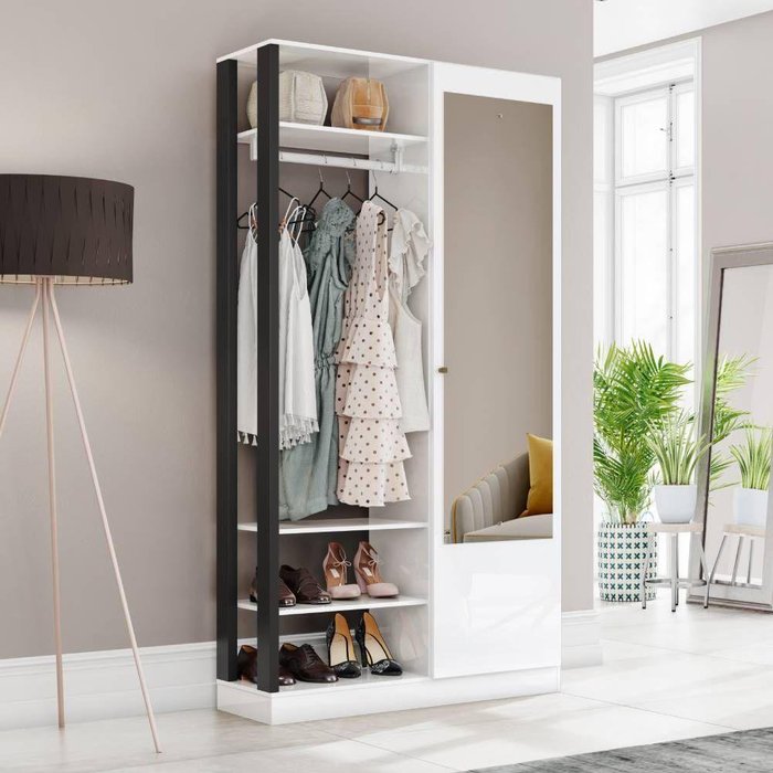 Armário Multiuso 1 Porta Com Espelho, 1 Cabideiro E 7 Prateleiras Astral Branco/pretochess - Henn