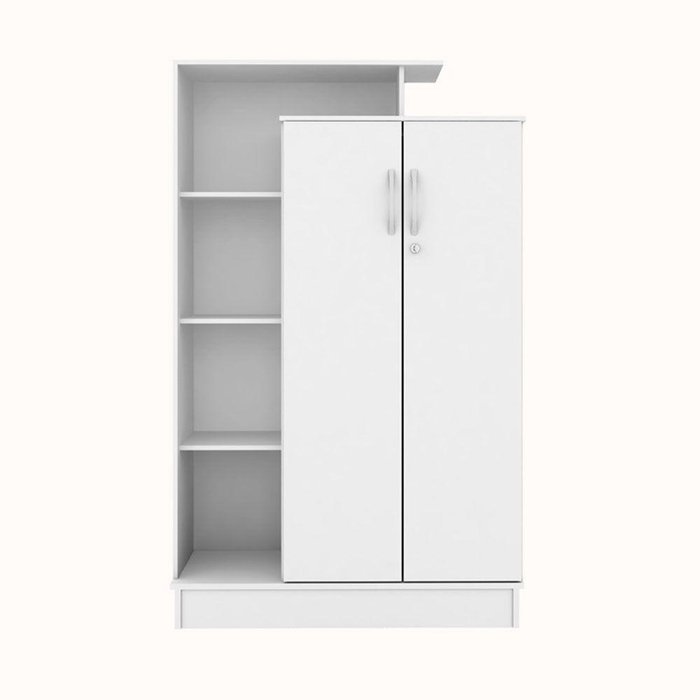 Versatilidade é a principal característica deste armário. A disposição das prateleiras em seu exterior e interior sugerem usabilidade permitindo acomodar pequenos e grandes objetos de forma organizada. Este armário foi produzido em MDP e revestido em pintura UV, a fim de apresentar durabilidade e resistência. Além disso, este móvel é composto por duas portas que acompanham fechadura e chave.