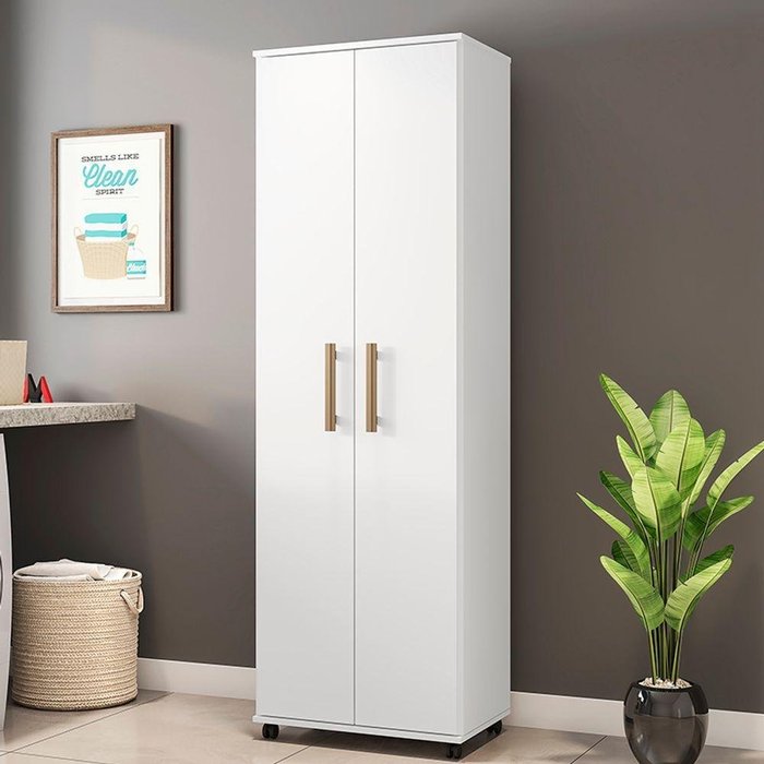 Armário Multiuso Para Lavanderia Itália Branco. Unindo a beleza, a versatilidade e o custo beneficio desenvolvemos o Armário Multiuso Para Lavanderia Itália. Fabricado em MDP de 15 mm que proporcionam melhor durabilidade ao móvel, acabamento pintura UV na cor Branco Brilho. Composto por 2 portas convencionais com dobradiças metálicas, gancho para objetos, puxadores com em PVC, o Armário Multiuso Para Lavanderia Itália possui 4 rodízios 2 com trava e 2 sem trava. Excelente para sua area de serviço ficar organizada e muito bonita. O Armário Multiuso Para Lavanderia Itália chegará na sua casa em 1 volume.
