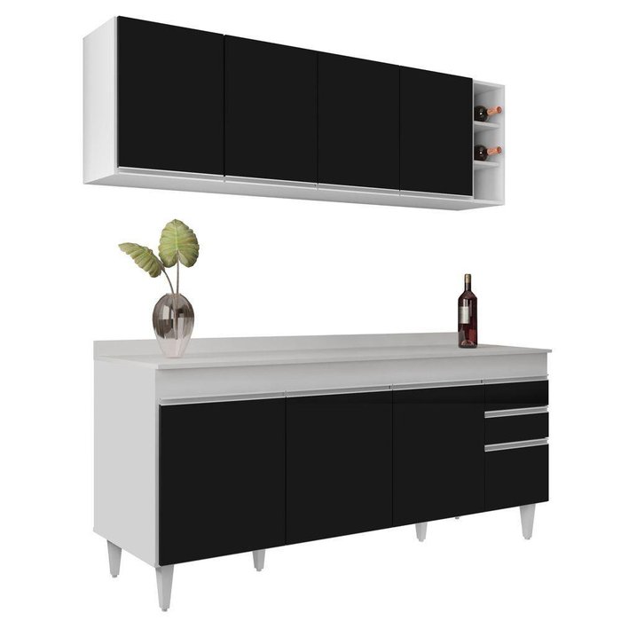 Armário Nevada E Balcão 180Cm Com Tampo Dallas Branco/Preto Preto
