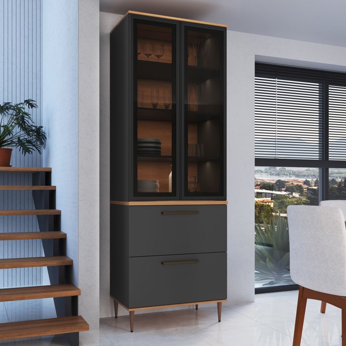 Armário Paneleiro 2 Portas 2 Gavetas Vidro Fume Isabelle Freijó/Grafite