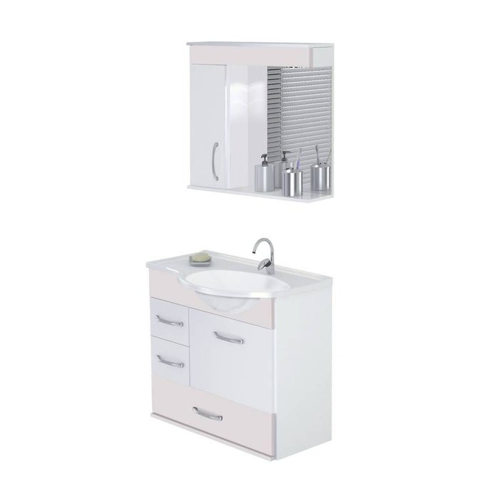 Estrutura ,portas e gavetas na cor Branca. Detalhes no frontão, molduras e gavetão nos gabinetes e frontão no espelheiro nos padrões de cores do modelo.