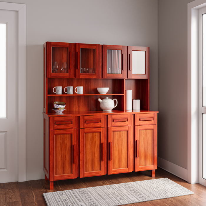 Armário São Luis, possui oito portas e quatro gavetas. Produzido com madeira Pinus (reflorestada) e HDF (fazendo montagem da madeira com HDF, não é 100% madeira), corrediças metálicas, dobradiça de pressão, 6 pés de madeira maciça, facilitando a limpeza, puxadores de madeira maciça e vidros nas portas superiores, tampo do balcão e prateleira em MDF de 15 mm, prateleira inferior interna em MDF de 9 mm. Excelente produto para compor o seu lar!