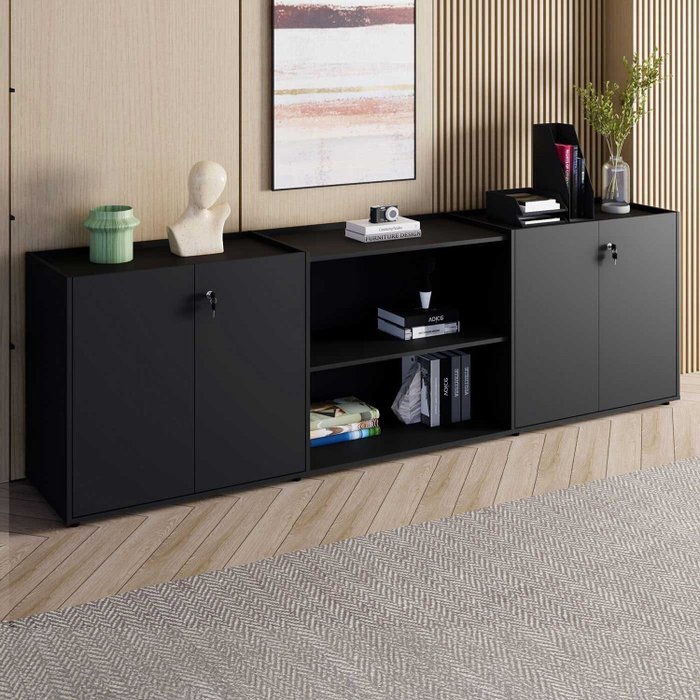 Armário para Escritório 240cm com 4 Portas Nicho e Tampo Embutido Corporate Preto