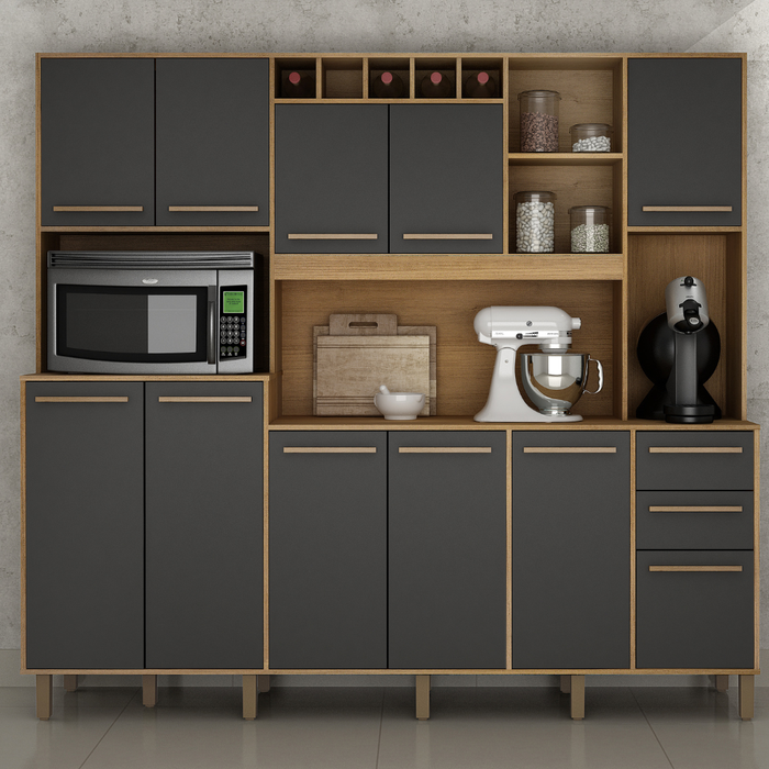 Descubra o Armário de Cozinha Petra: moderno e funcional, com três opções de cores. Nicho para garrafas e micro-ondas, proporcionando organização inteligente. Transforme sua cozinha com estilo e praticidade! Adquira o seu agora mesmo!