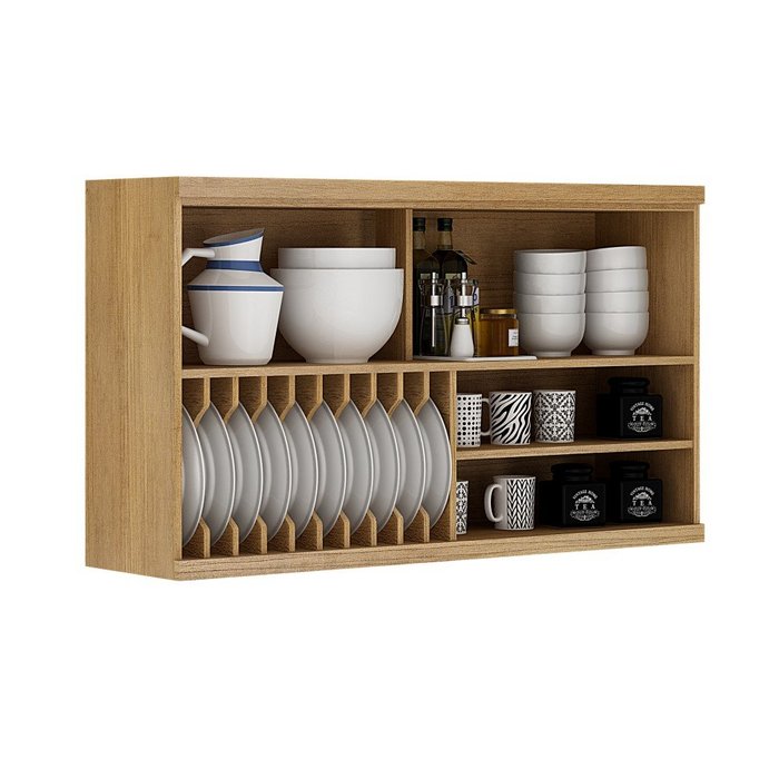 Esse modelo é composto por armários e prateleiras suspensos na parede, o que ajuda a aproveitar melhor a área disponível na cozinha.