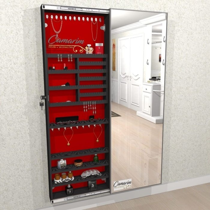 | Itens Inclusos | Fundo de Veludo Frente das gavetas em MDF 6mm em arabesco Laqueado Fechadura com duas chaves Porta de espelho 4mm (moldura de alumínio) Abertura da porta através de Corrediça telescópica Acessórios de Fixação |