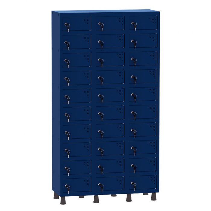 Armário Porta Objetos de Aço 3 Vãos 30 Portas Fechadura Pandin 1,90 m Azul Del ReyPRODUTO ENTREGUE DESMONTADO.FICHA TÉCNICAModelo: APOF 503/30.Medidas Externas (A x L x P): 193 cm x 103,5 cm x 40 cm.Medida Interna de cada compartimento(A x L x P): 18 cm x 34 cm x 39,5 cm.Sistema de fechamento por Fechadura. Sistema Pivotante de portas.Conforme normas NR17.COMPOSIÇÃOArmário de aço confeccionado em chapa 26 (0,45mm) totalmente montável. Dispensa a utilização de parafusos.Laterais, Retaguarda, Prateleiras e Portas confeccionadas em chapa 26 (0,45mm) .Base confeccionadas em chapa 24 (0.60mm).ACABAMENTO Acompanha kit pé regulável Pintura eletrostática a pó (tinta híbrida) na cor cinza cristal Pintura em esmalte sintético nas demais coresGARANTIA12 meses de garantia contra qualquer defeito de fabricação.