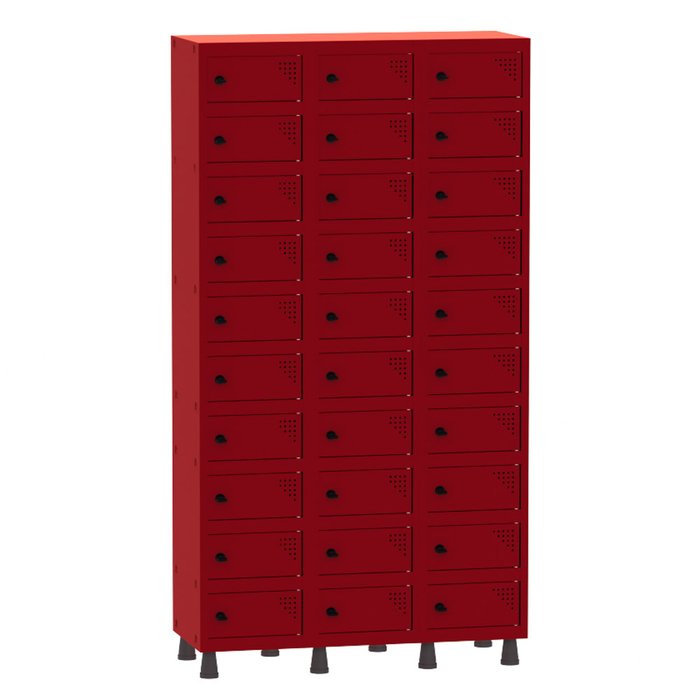 Armário Porta Objetos de Aço 3 Vãos 30 Portas Pitão Pandin 1,90 m VermelhoPRODUTO ENTREGUE DESMONTADO.FICHA TÉCNICAModelo: APOP 503/30.Medidas Externas (A x L x P): 193 cm x 103,5 cm x 40 cm.Medida Interna de cada compartimento(A x L x P): 18 cm x 34 cm x 39,5 cm.Sistema de fechamento por Pitão para cadeado. Sistema Pivotante de portas.Conforme normas NR17.COMPOSIÇÃOArmário de aço confeccionado em chapa 26 (0,45mm) totalmente montável. Dispensa a utilização de parafusos.Laterais, Retaguarda, Prateleiras e Portas confeccionadas em chapa 26 (0,45mm) .Base confeccionadas em chapa 24 (0.60mm).ACABAMENTO Acompanha kit pé regulável Pintura eletrostática a pó (tinta híbrida) na cor cinza cristal Pintura em esmalte sintético nas demais coresGARANTIA12 meses de garantia contra qualquer defeito de fabricação.