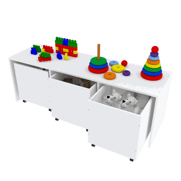 Móvel composto de 3 espaços com 3 caixas para guardar objetos