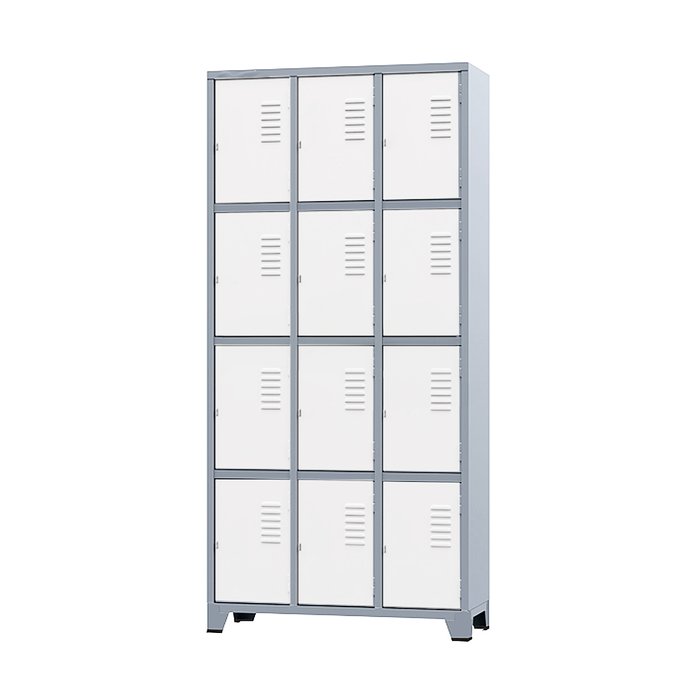 CONEXÃO OFFICEArmário Roupeiro de aço para vestiário,ideal para academias, surpermercados, empresa e para uso geral. Produzido em aço chapa 26 0,45mm de alta qualidade com tratamento anti-ferruginoso, o acabamento em sistema de pintura eletrostática a alta temperatura epóxi, tambem garante maior durabilidade da cor e resistencia a ferrugem. Possui 12 portas com venezianas para ventilação, compartimentos de tamanhos médios independentes sem divisórias internas, que garante que você consiga armazenar itens como bolsas, mochilas e entre outros. O fechamento das portas é através de chave. Características:- Quantidade de Portas: 12- Cor: Corpo Cinza / Portas Brancas- Chapa: 26 / 0,45mm- Medida das Portas/ Vãos: 046Alt x 027Larg- Sistema de Ventilação: Veneziana- Fechamento: chave- Quantidade de cabides por porta: 0- Pés removíveis: Não- Desmontável: Não ( Exceto portas que podem ser trocadas ).- Pintura: Epóxi Pó- Imagens meramente ilustrativas.- As cores podem apresentar variações de tonalidade.ALTURA: 197cmLARGURA: 92cmPROFUNDIDADE: 36cmPESO: 40kgEspecificação de chapa e acabamento: Roupeiro produzido em chapa de aço tratada com antiferruginoso por fosfatização e pintura epóxi-pó por processo eletrostático.