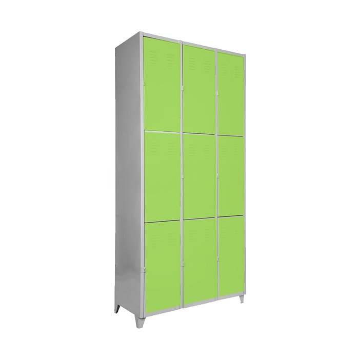 CONEXÃO OFFICE Armário Roupeiro de aço para vestiário, produzido em aço chapa 26 0,45mm, possui 3 portas com venezianas para ventilação, compartimento de tamanho grandes independentes sem divisórias internas, fechamento das portas através de CHAVE.Características- Quantidade de Portas: 9- Cor: Verde- Chapa: 26 / 0,45mm- Medida das Portas/ Vãos: 092Alt x 027Larg- Sistema de Ventilação: Veneziana- Fechamento: CHAVE- Quantidade de cabides por porta: 2- Pés removíveis: Não- Desmontável: Não ( Exceto portas que podem ser trocadas ).- Pintura: Epóxi PóALTURA: 198cmLARGURA: 093cmPROFUNDIDADE: 37cmPESO: 30kgGARANTIA: 6 MesesEspecificação de chapa e acabamento: Roupeiro produzido em chapa de aço tratada com antiferruginoso por fosfatização e pintura epóxi-pó por processo eletrostático.
