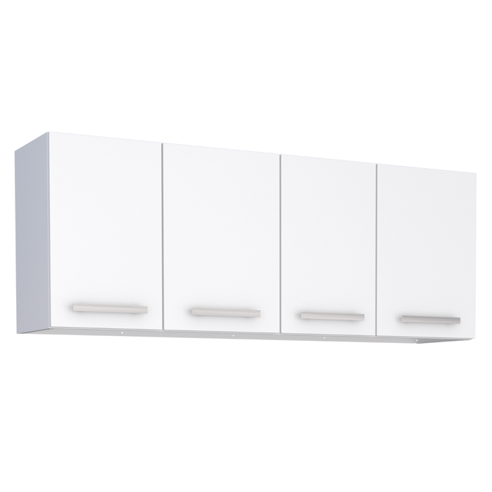 Esse modelo é composto por armários e prateleiras suspensos na parede, o que ajuda a aproveitar melhor a área disponível na cozinha.