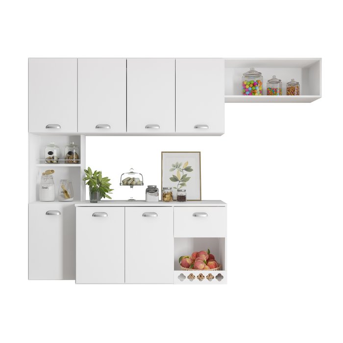 Conta com 7 compartimentos com portas, ideais para armazenar itens como panelas, vasilhas e outros objetos maiores que não desejamos ter a mostra. Também possuí 4 nichos abertos, perfeitos para acomodar itens indispensáveis e de uso diário, como: liquidificador, porta-utensílios, condimentos, entre outros.