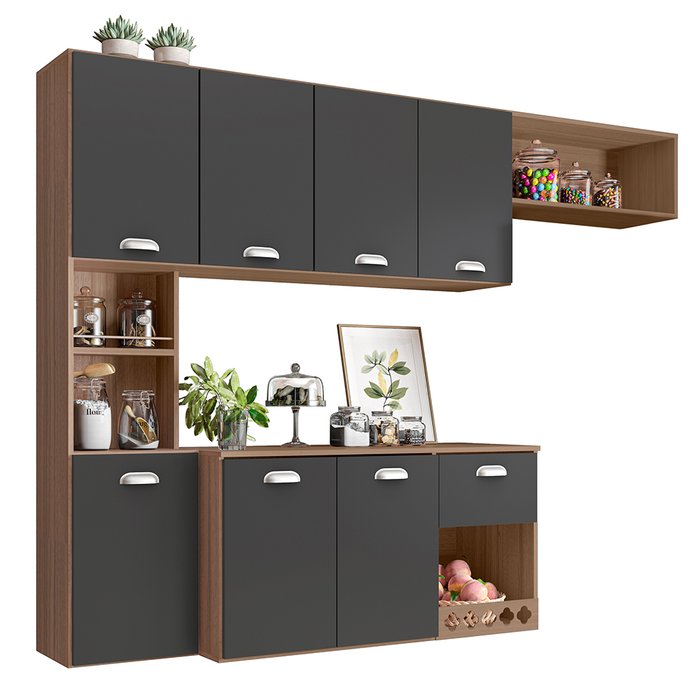 Conta com 7 compartimentos com portas, ideais para armazenar itens como panelas, vasilhas e outros objetos maiores que não desejamos ter a mostra. Também possuí 4 nichos abertos, perfeitos para acomodar itens indispensáveis e de uso diário, como: liquidificador, porta-utensílios, condimentos, entre outros.