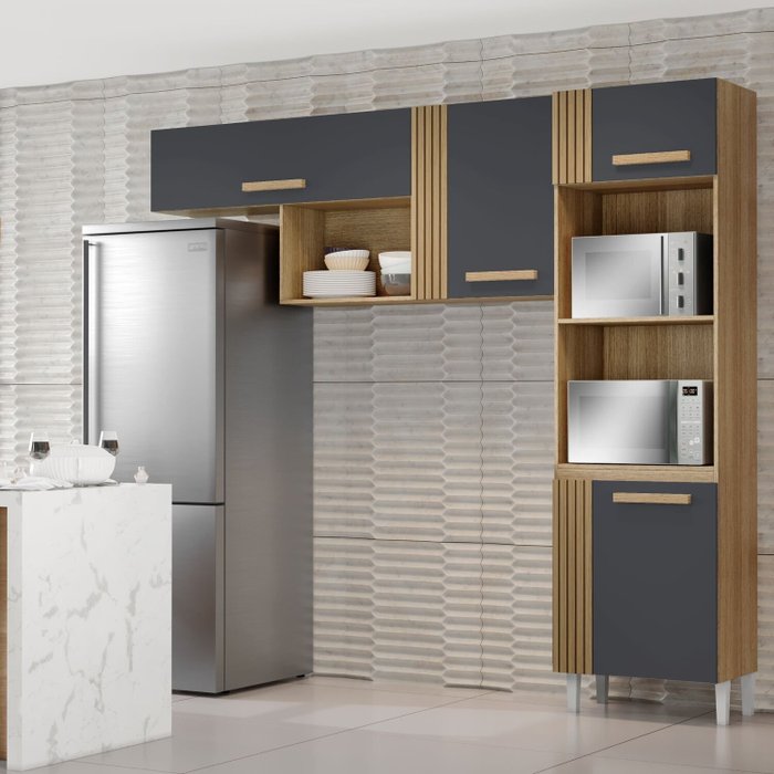 Armários para Cozinha Compacta 3 Peças com Torre Quente Aéreos 4 Portas Sem Balcão Vitória Atacama/Grafite