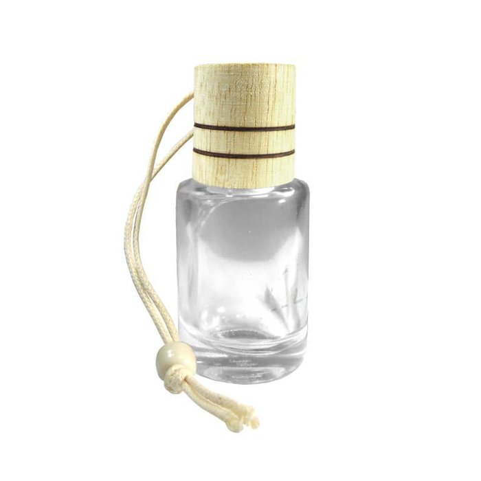 Material de vidro transparente, indicado para aromatizadores de carros e pequenos ambientes acompanha batoque e tampa de madeira com cordão.
