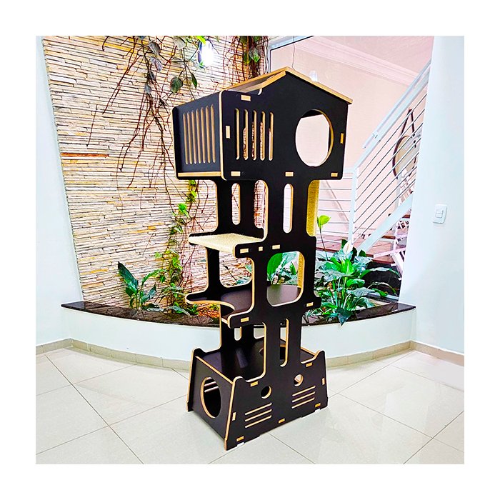 . Abaixo segue a descrição de nosso produto, esperamos tirar todas as suas dúvidas, mas caso ainda tenha alguma questão a ser respondida, entre em contato que respondemos rapidinho Armário tipo torre, com arranhador e caminha para gatos modelo SIMBAH na cor preta Satisfação total do seu gato Produto com alto padrão de qualidade, feito em MDF de 15 mm revestido 1,53 de altura 0,70 cm de comprimento 0,48 cm de profundidade enviado desmontado, a montagem é extremamente simples, deve ser feita pelo comprador, acompanha manuais