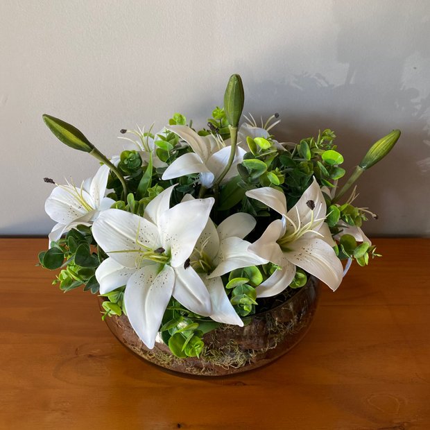 Arranjo Centro de Mesa Lírio Branco Artificial Completo Grande